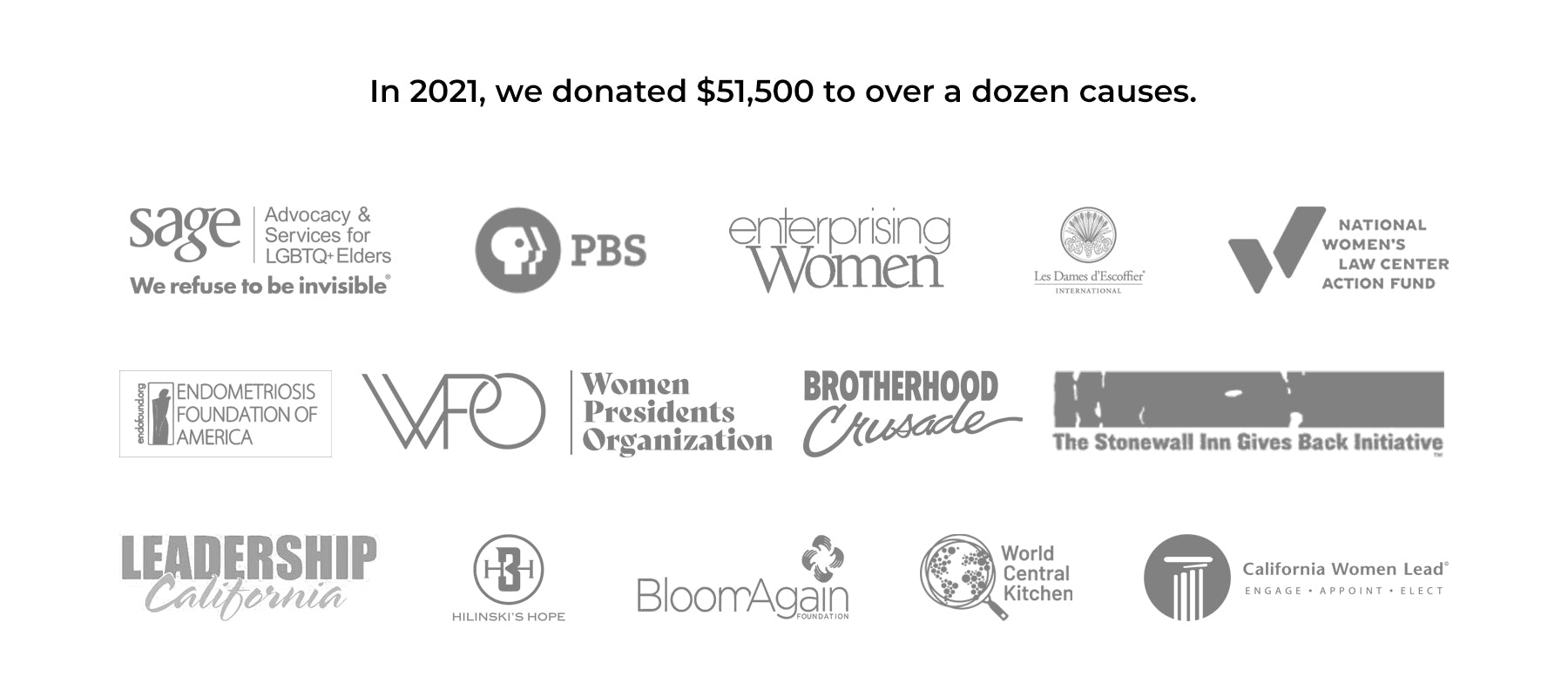 We donate 10% of profits to organizations that empower women and promote gender and racial equity. In 2021, we contributed $51,500 to organizations dedicated to gender and racial equity.